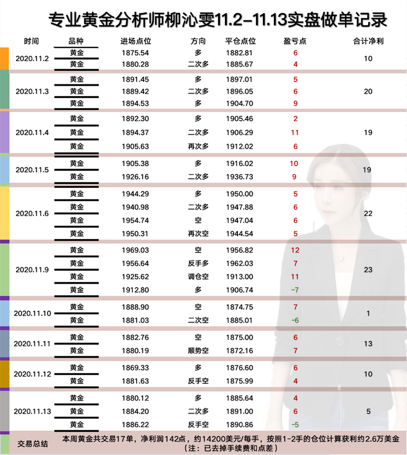 对于本周的一个交易而言,最值得沁雯开心的就是周一的一个获利,单日净利润到达了23美金,不出意外,当日在金价上下波动达150美金的情况下,控制风险尤为重要。这也是延续了上周交易的节奏。那么这11月到目前为止,操作了17单,获利142美金,1-2手交易2.6万美金。