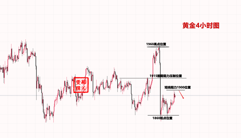 黄金在结构上已经上升,但是承压4小时的上轨道压制,承压日K的中轨压制,这里形成的是共振的压制,所以在1900上下是有个回撤的,这个回撤的目标分别是6美金和11美金;具体是否回调,要看下周了。