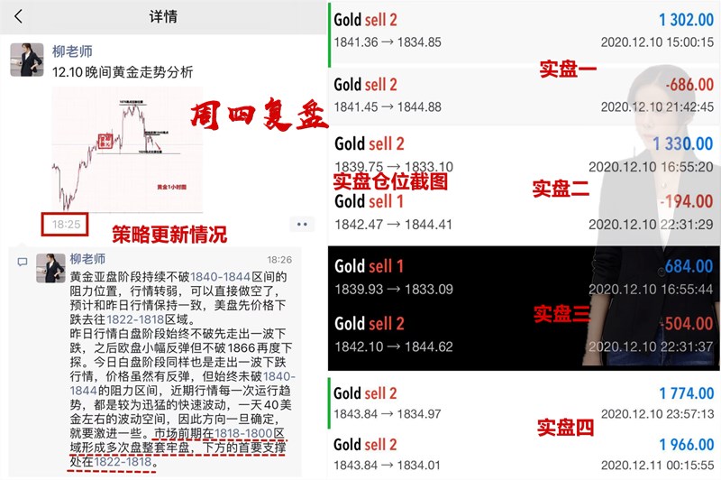 周四交易说实话,还是有点小遗憾的,午后在1839-41的空成功在1833成功盈利;第二单依旧再次空单进场,但是晚间由于欧洲央行的讲话刺激金价上涨,为了防止意外发生,我们只能在1844小损出局;第三单并不是每位实盘都参与进来,主要是时间太晚了,只能给到时间方便的朋友交易,晚间金价冲高1850受阻回落,顺势继续在1843空进场,最终在1834成功利出。