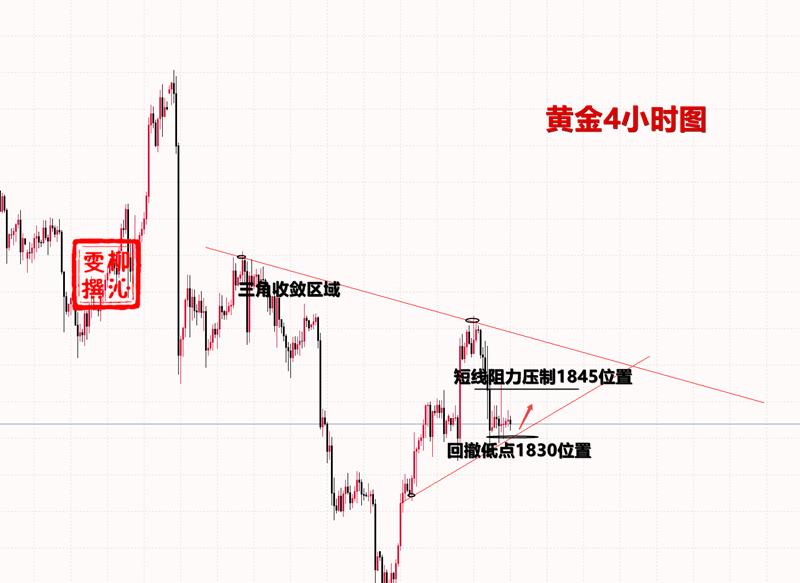 隔夜黄金整体陷入区间震荡,目前4小时图构成三角形整理,上方阻力位1845,下方支撑位1830,静待区间破位抉择方向。在破位之前,尽量减少交易,朝着一个方向去操作就可以了。对于整体势头来说,我们认为守住1830防线,那么进一步反弹向上的概率较大。