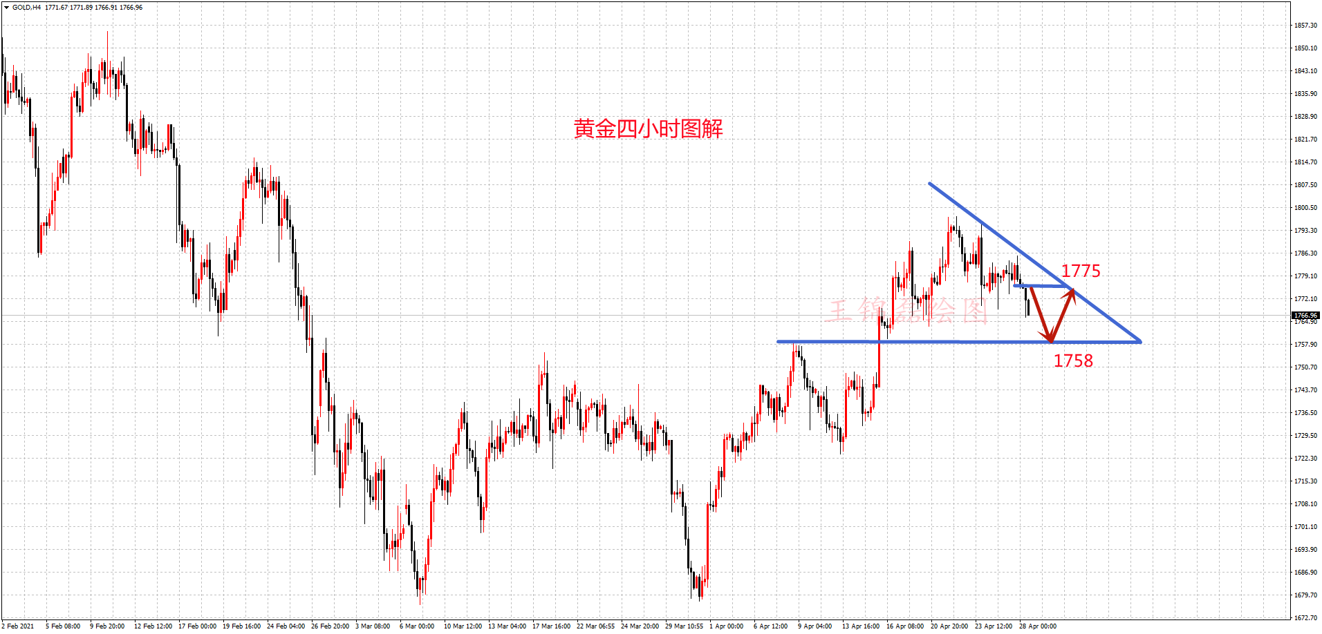 所以,尽管早盘金价短线反弹,看似凶猛,但是并未突破1775,仍是非常好的补空的机会。所以,笔者空单浮盈继续持有,坚持看到1760-58一线。需要注意的一点是,下方1758附近是前高突破,以及日线中轨支撑,金价在此一线若守住跌势,笔者考虑反手干多,再加美联储明日凌晨公布利率,两者配合,金价必然反弹,值得一搏。