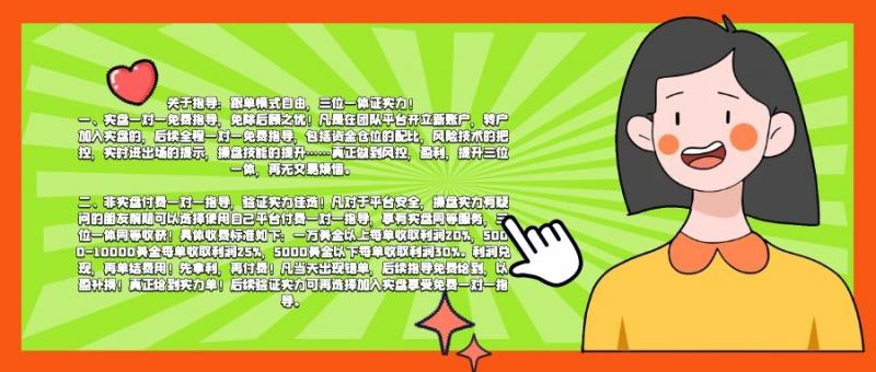 针对实盘提供一对一免费金油交易指导,包括实时单子进出场的提示,技术把控,资金仓位配比,风险控制等……有需要可以加入实盘指导。另外可以针对非实盘可以提供付费指导,收费根据资金量大小收取每单利润百分比,有需要可以具体了解。