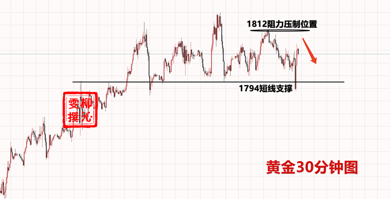 按照早间的一个反弹空思路去交易,早间我们将1799持仓过夜的多单在午间到达1811附近拿下盈利,反手给到1812的空单进场,这也是交易的一个重点,金价触及阻力位置附近,午后多单不在早间的一个思路,所以不要因为一个小的波动影响整体的一个操作,交易的整体性很重要。