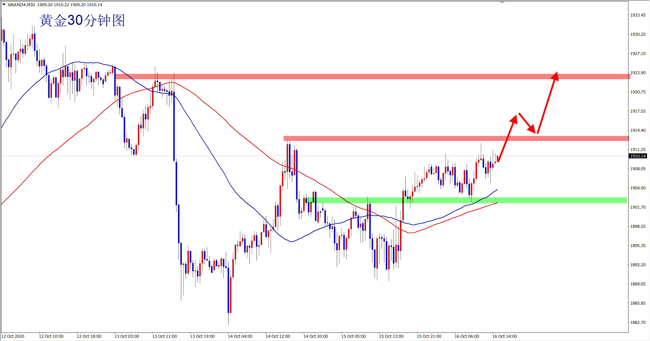 今日行情暂时维持1902-1913区域内运行,美盘回落1905附近即可再次进场干多,防守1897位置,只要不再次跌入到1900下方的震荡中,黄金就是多头反弹走势!如果行情能直接反弹突破1913,那么美盘可能会继续上涨拉升至1920甚至1930区域!