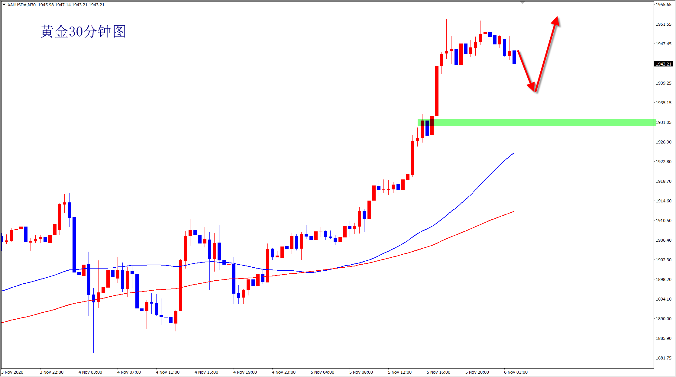 昨日黄金多头突破重重阻力,一举拿下1930阻力,来到1950压力区域附近,强势多头走势,回调是正常的,但回调后黄金必将再次上涨!干多是当前唯一的策略,依托1935支撑就是多!美盘大非农数据后黄金还将继续上行,干多,欧盘回落还是继续多!