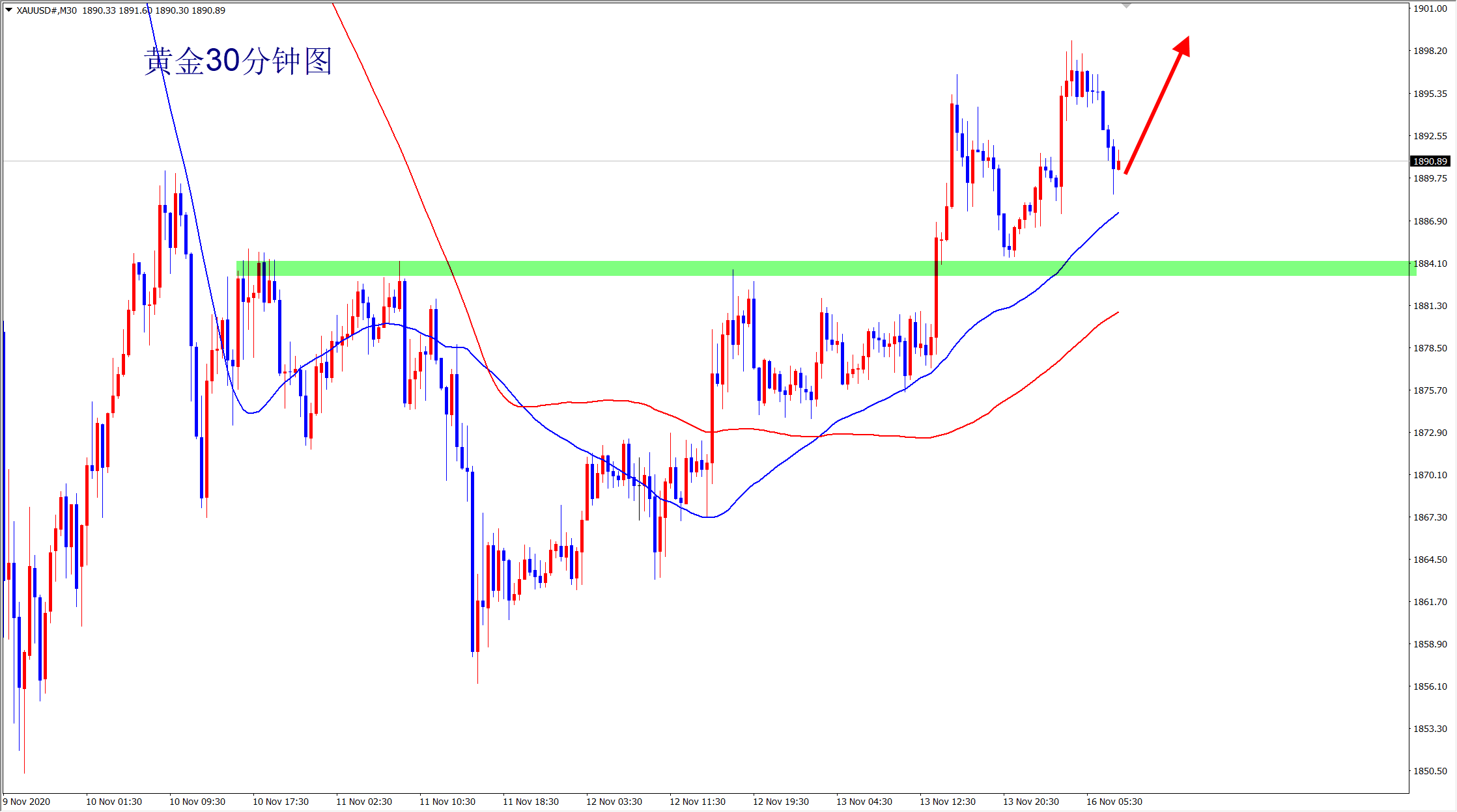 黄金当前在30分钟走势图上非常规律,受到均线的支撑上涨,午后行情回落,给早上没有进场的二次进场干多的机会,接下来将会继续测试突击1900整数关口,如果本次上涨行情不能有效突破,就要引起我们的警惕!