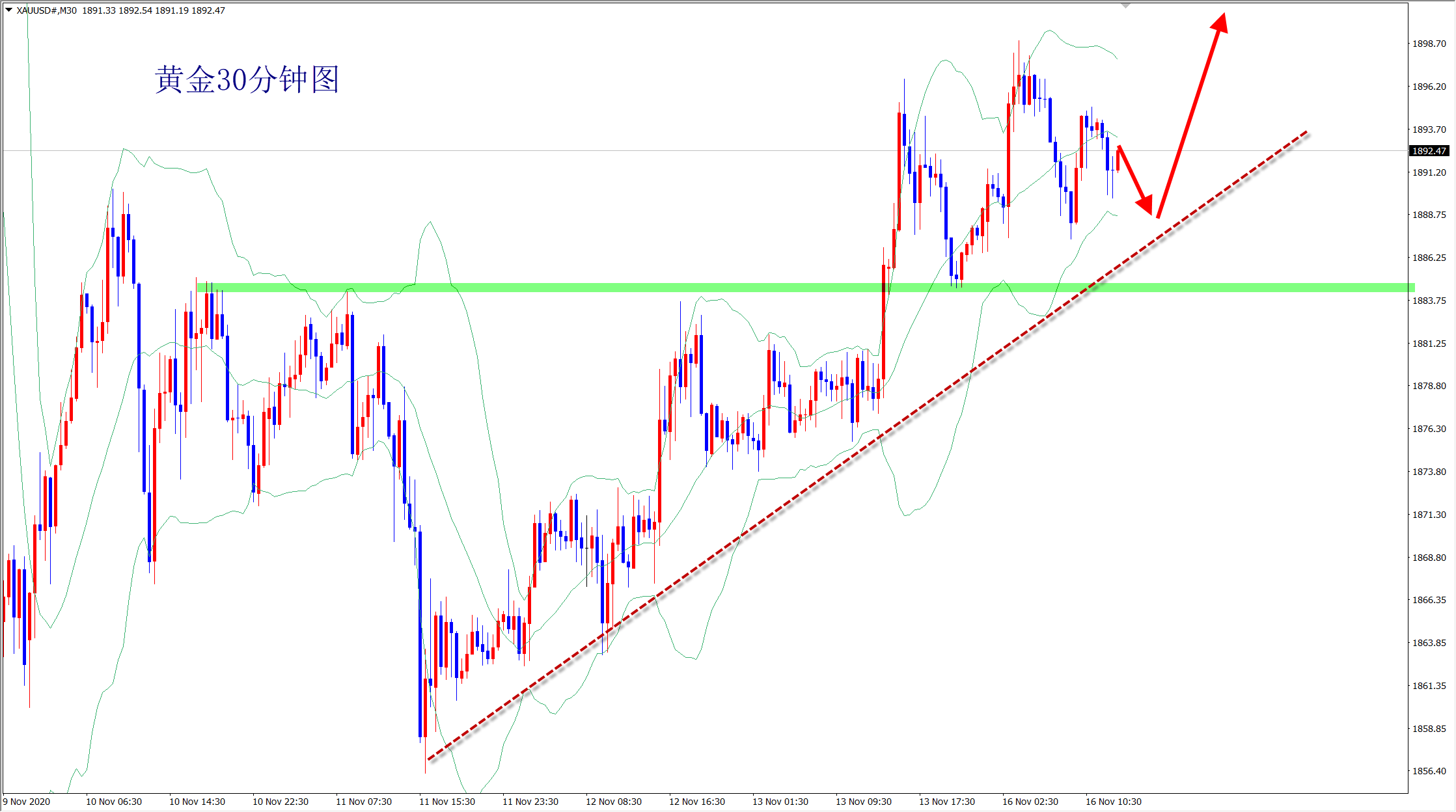 黄金日内整体波动幅度有限,下方1886一线支撑,上方1898阻力,短线围绕1890附近震荡,但当前震荡反弹的格局没有改变,美盘还是低多为主,回落1885支撑附近干多!