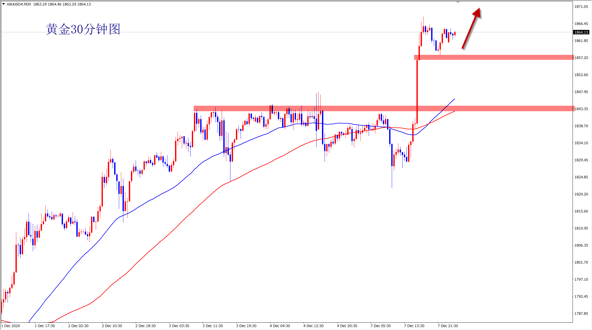 黄金昨日先跌后涨,美盘大涨拉升突破1844阻力创出反弹新高,并且重新进入到此前的日线盘整内部,多头走势无疑,大阳之后必有惯性冲高,早盘1858上直接多!
