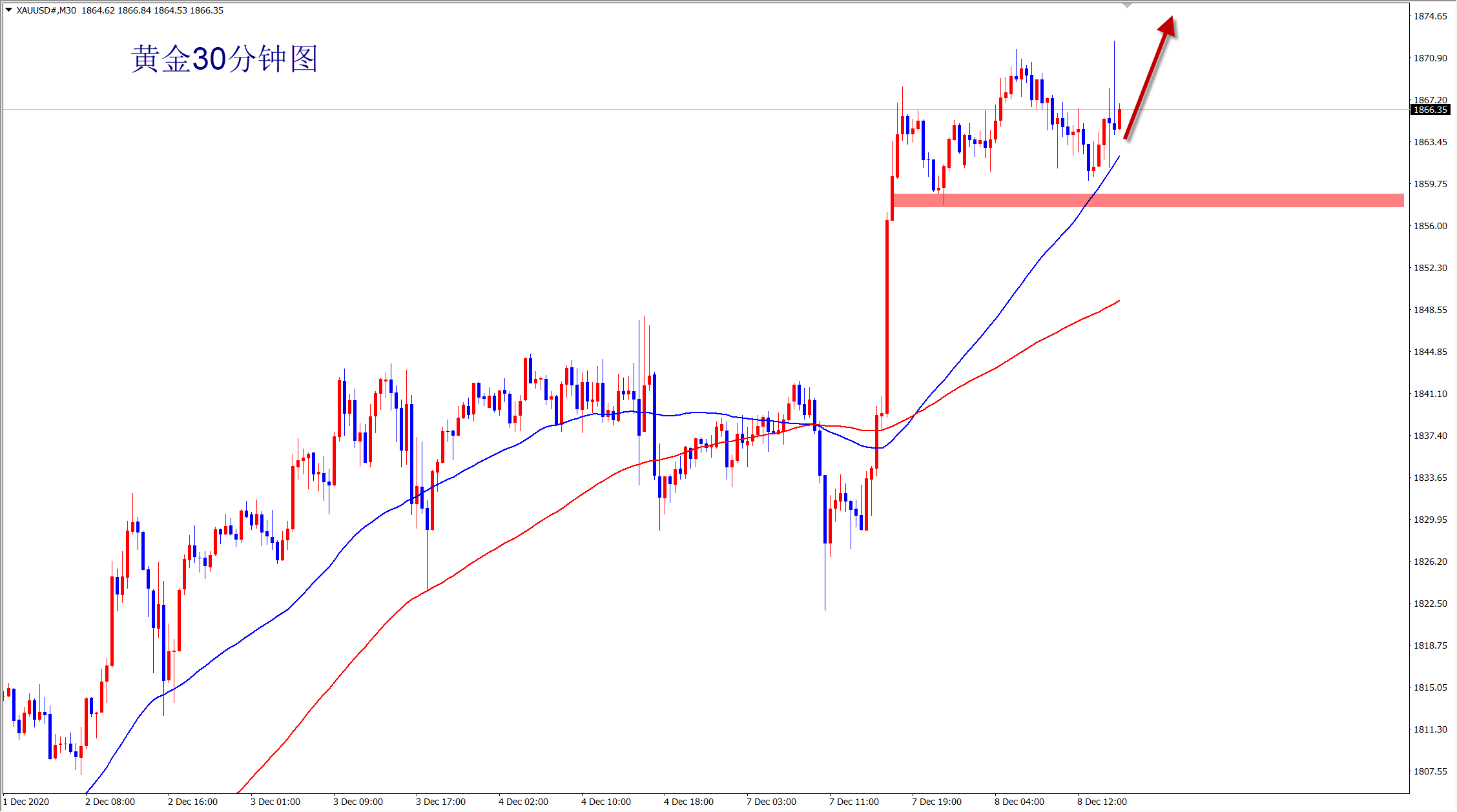 美盘黄金还是继续看涨不变,1880是我今日强调的小目标位置,相较于昨日的上涨来说,不值一提!方向明确,思路清晰,果断执行即可!回落仍旧继续多,美盘依托1858支撑继续看涨!