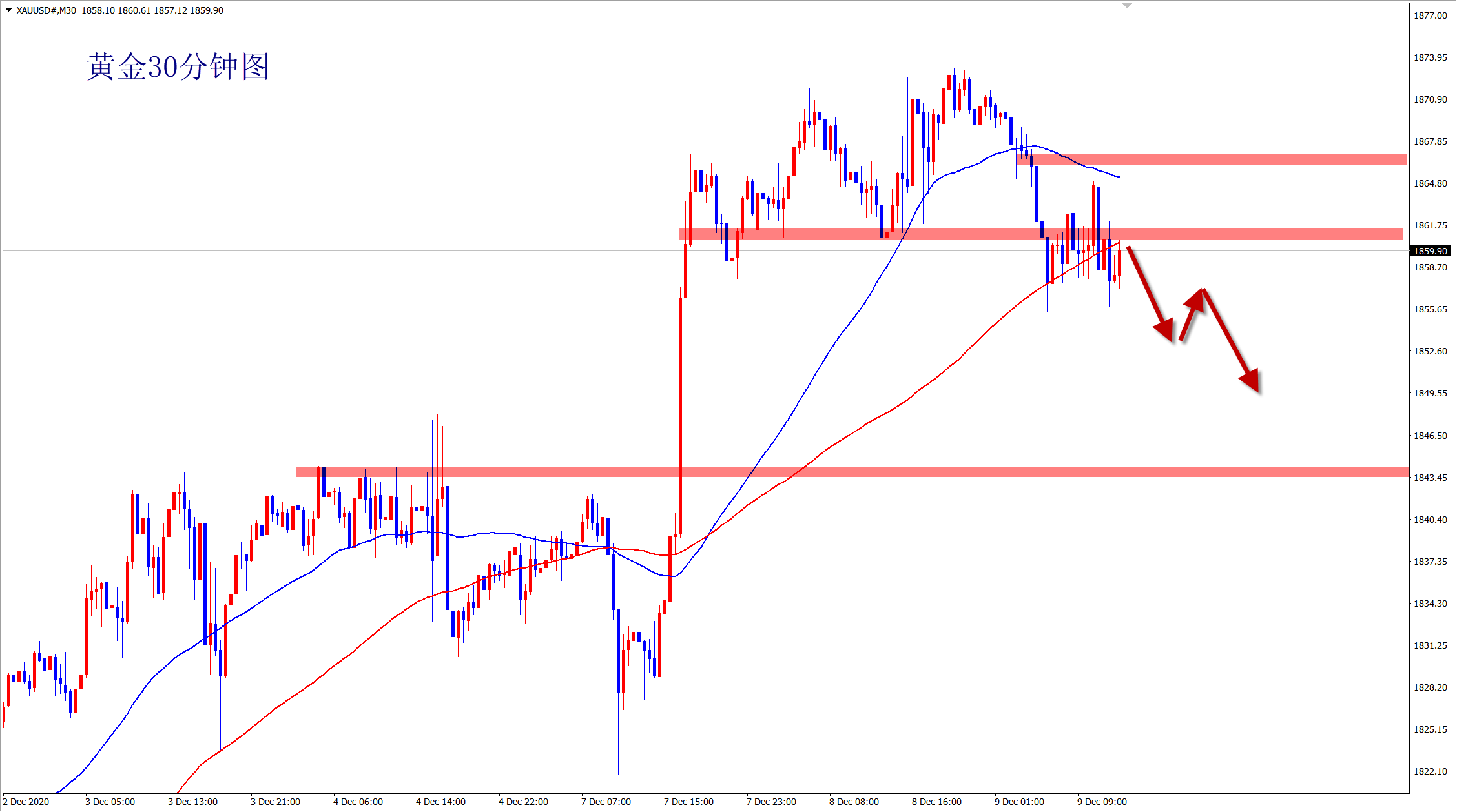 黄金现在1860附近可以空单直接进场,防守1867,下看1852到1844一线!