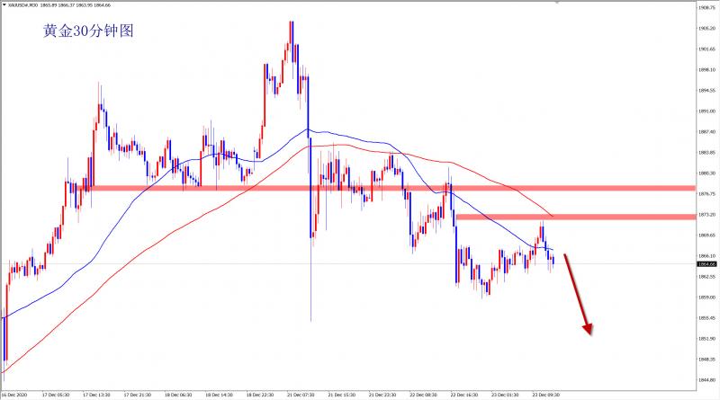 黄金明显的下跌空头走势,自1906位置的下跌开始,这已经是注定的结局,而现在下跌远没有结束,虽然当前行情暂时在1858位置获得支撑,但是反弹力度有限!30分钟级别上黄金一直受到均线的压制,当前的关键压力就是1872位置,美盘此位置依然是空头走势,一旦下行破位1858后大概率跌至1840一线!