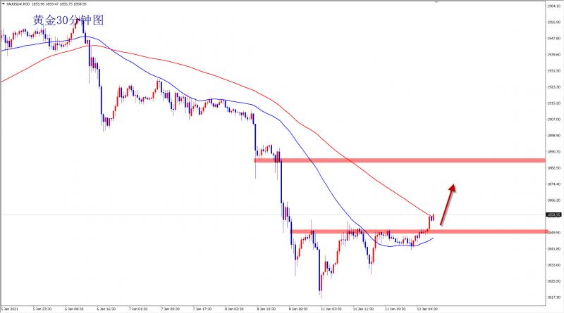 黄金1855多,止损1847,目标1865-1880;