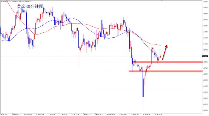 黄金今日由于马丁路德金纪念日,美盘提前休市!美盘黄金波动不会太大,只会沿当前的方向继续反弹,再次跌至1826下方的可能不大,回落依然可以继续进场干多!上方暂时承压1840位置,突破后必然会再次上攻1860位置!