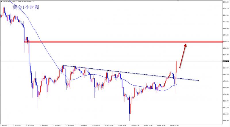 今日美国总统正式交接,黄金大起大落洗盘,最终黄金选择向上突破,当前行情已经脱离底部盘整区域,方向明确,上涨只是时间问题!交易中总会有出人意料的行情出现,但最终的逻辑不变!方向明确了就是大胆跟进!