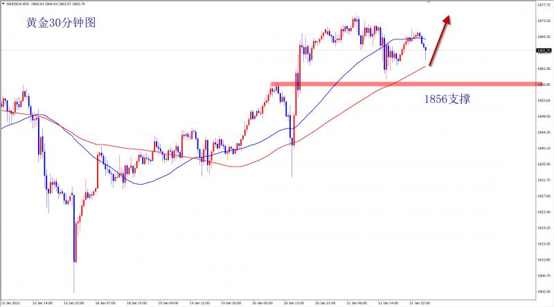 欧盘在1860位置直接进场干多了,盘整上方的横盘整理,蓄势后还将继续拉起!大涨无惧回调,直接干多!只有跌破1855的情况下我们才会改变我们的操作思路!否则将干多进行到底!