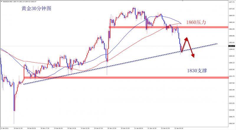 黄金遇阻1875后调整,今日最终弱势回调,破位1860正式开始跌势,而且一发不可收拾!日内顺势跟进1853空,1850空,如期大跌,破位1840后必然跌至1830一线,如果破位1830拿将会是瀑布大跌走势,直接下行1800也是可能的!
