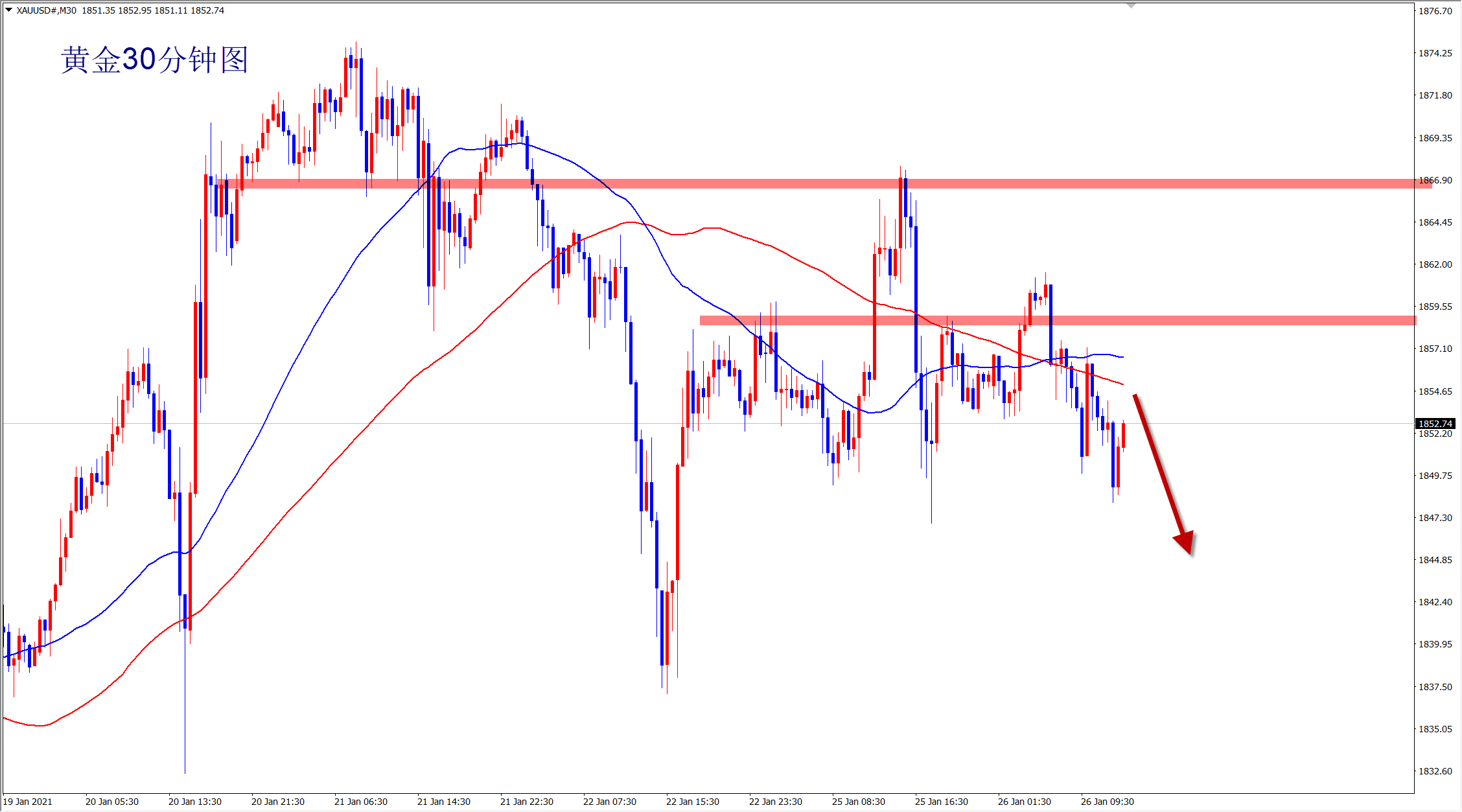 黄金1860空,止损1867,目标1850-1845;