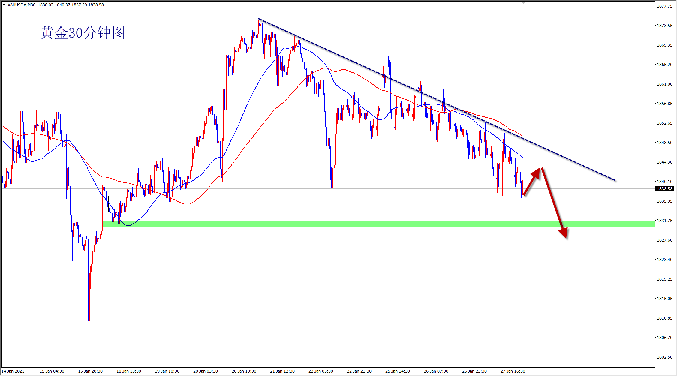 黄金1843空,止损1850,目标1830-1820;
