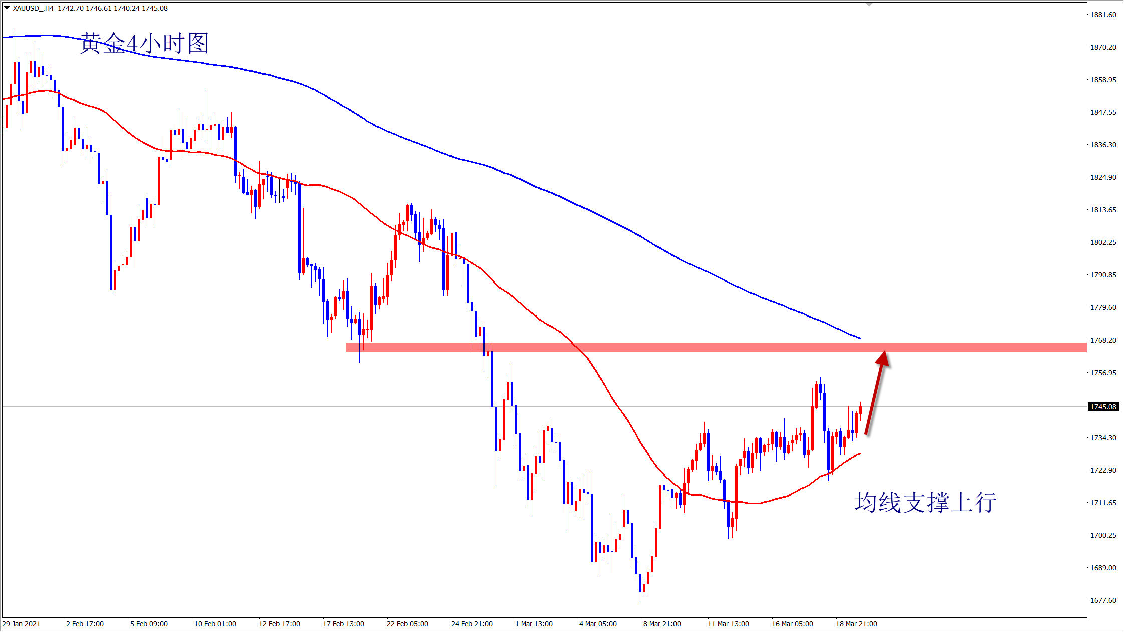 黄金日线上走出多方炮形态,预计下周还是反弹上涨,周线上两周连阳,属于超跌后的反弹走势!4小时走势上,黄金踩50均线上行,多头排列!上方最近的压力位置是1760-1770区域内!预计本次反弹至少要测试此压力区域,如果突破,将会涨至1800上方!遇阻情况下,黄金会在底部构建盘整!