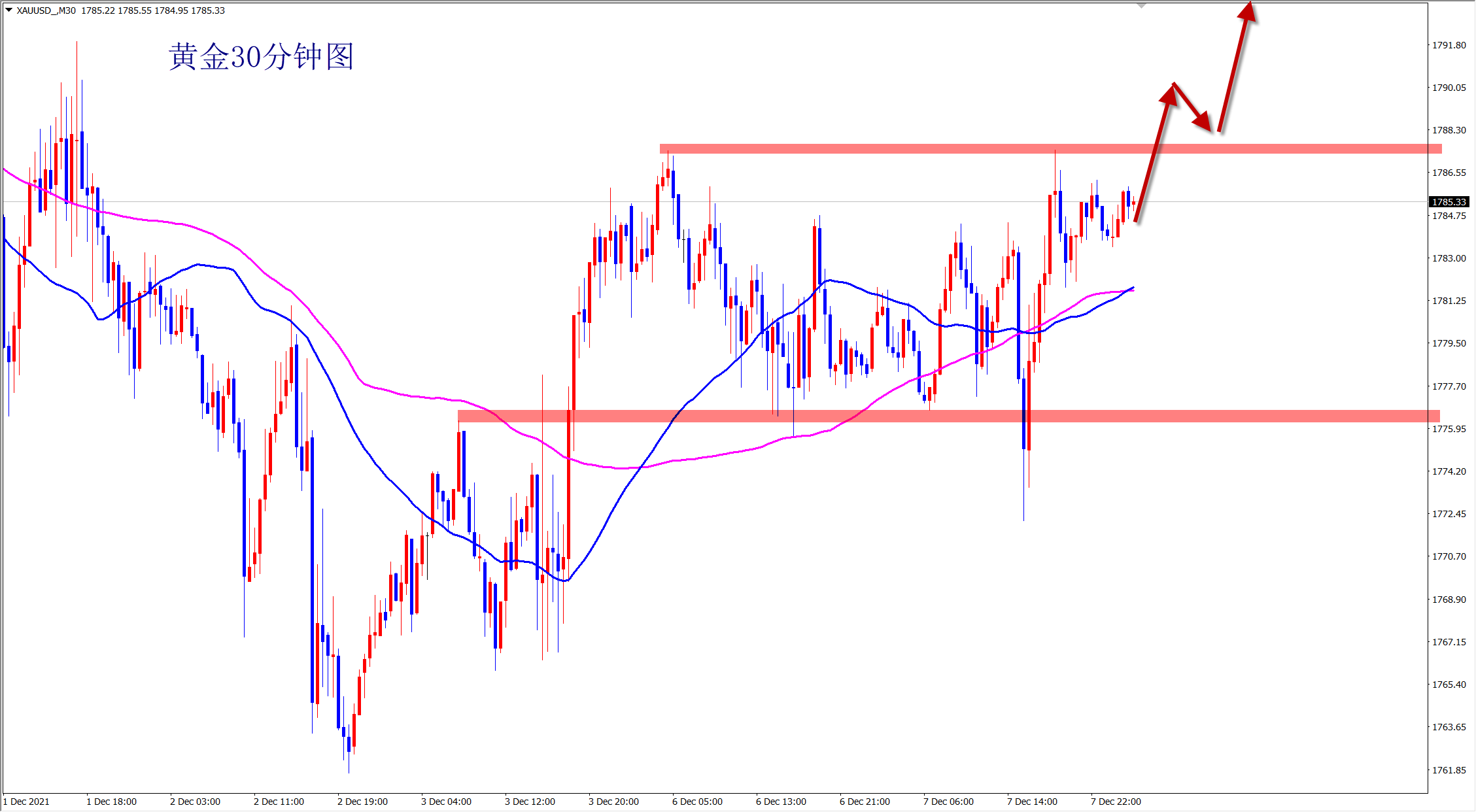 黄金昨日探底一波后强势拉升,深V反弹,多头强势,当前暂时受到1787位置的压制,但多头走势不变,昨日行情探底后我们果断1780位置干多,如期拉升1787一线!多头上涨即将启动,今日1780附近继续干多!
