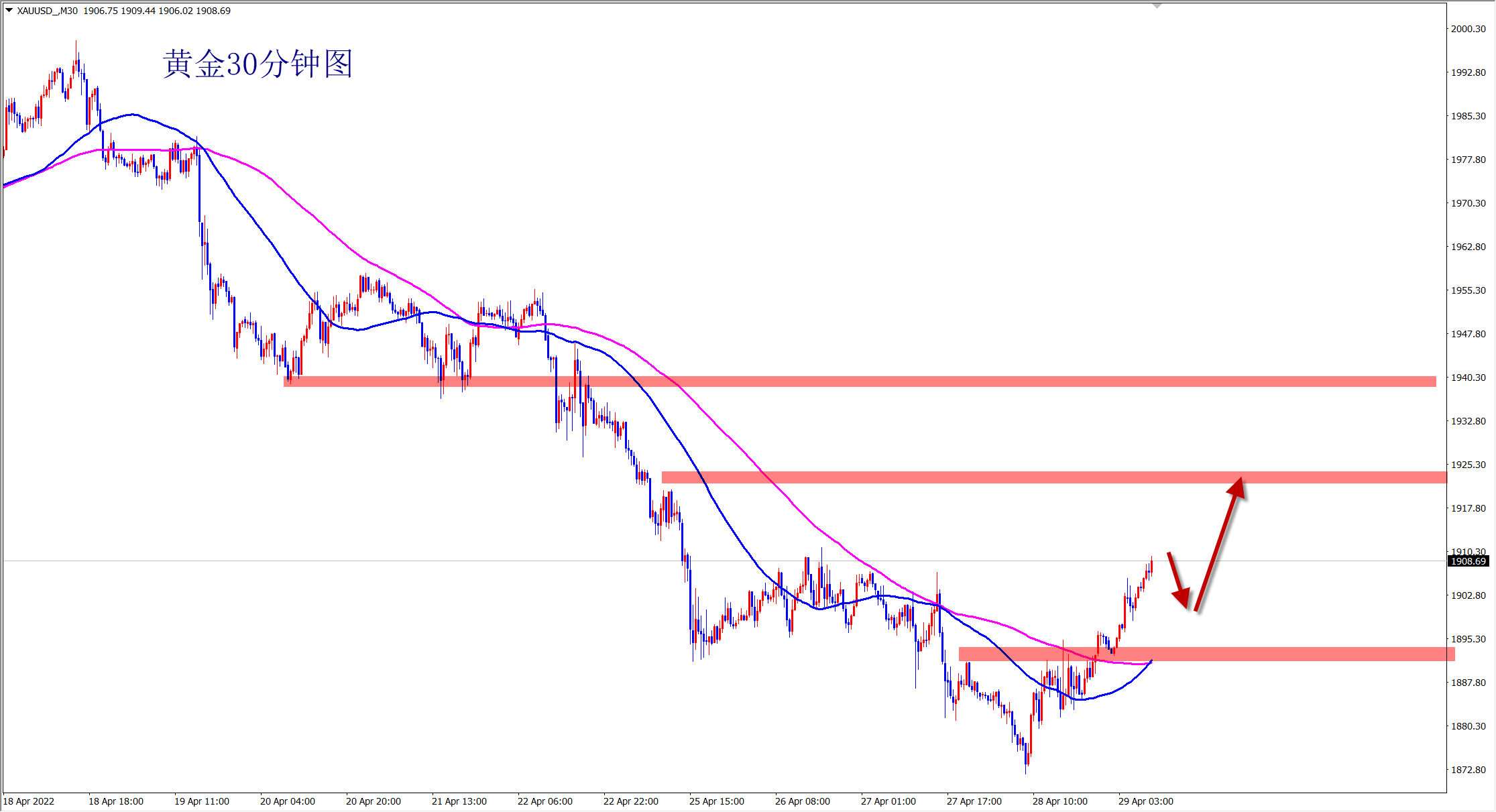 下跌已经结束,当前开启上涨,思路就要及时跟进,1910此前是压力,突破后多空转换,压力变支撑,将会成为美盘我们干多的关键支撑!回落直接多!