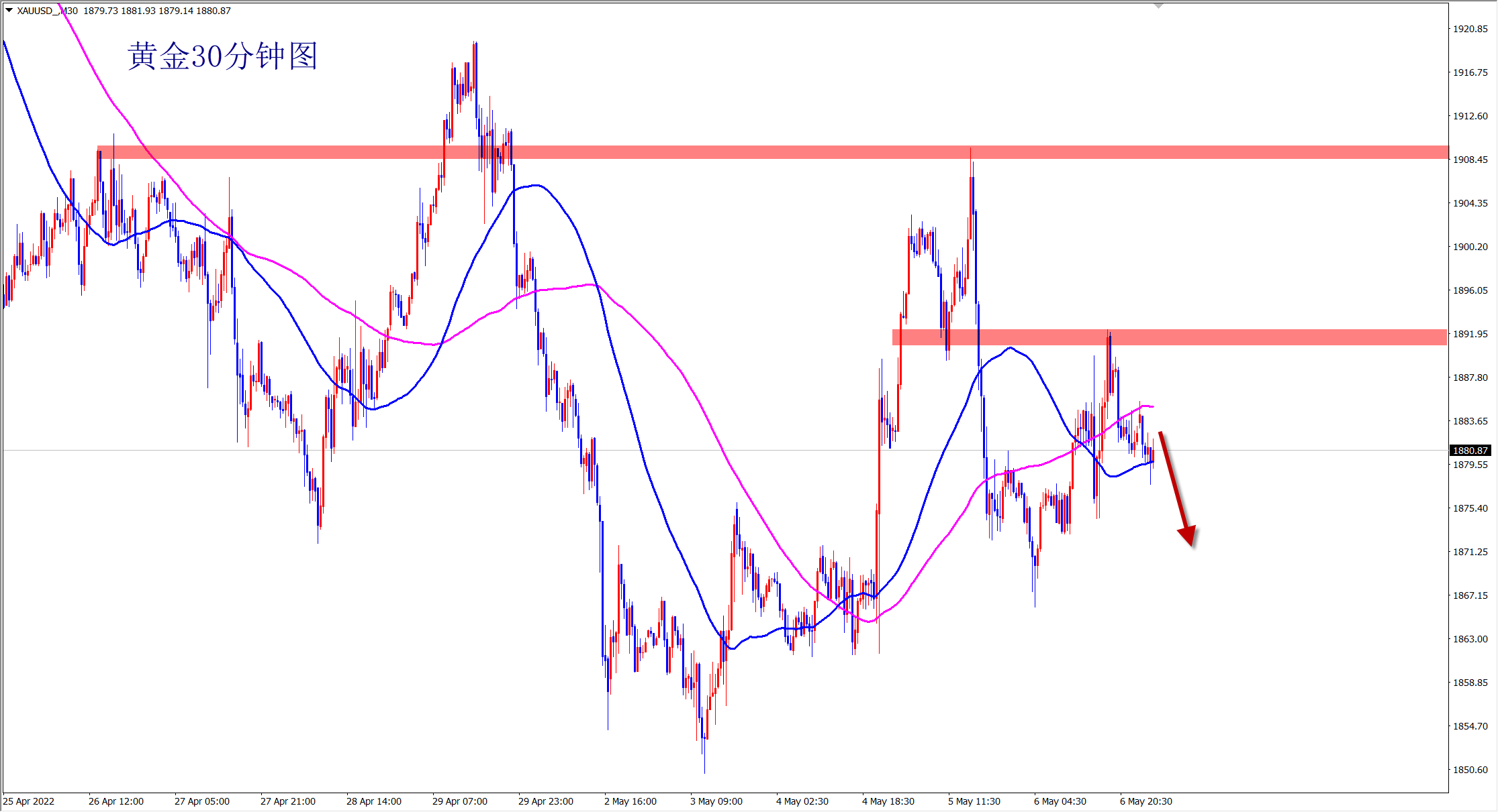 黄金反弹再次遇阻1890压力,上涨无力,还是空头走势,早盘依托1890的压力继续看跌!