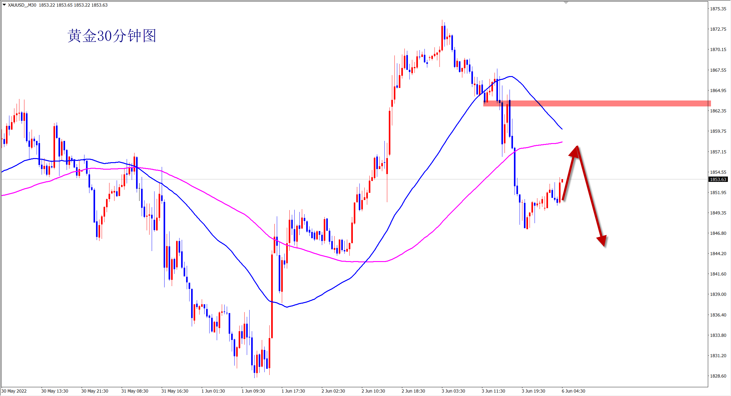 黄金周五没有延续上涨,而是单边下跌,强不再强必转弱!而且本次下跌破位1860的支撑,行情转跌!早盘反弹依托1862的压力开始干空了!