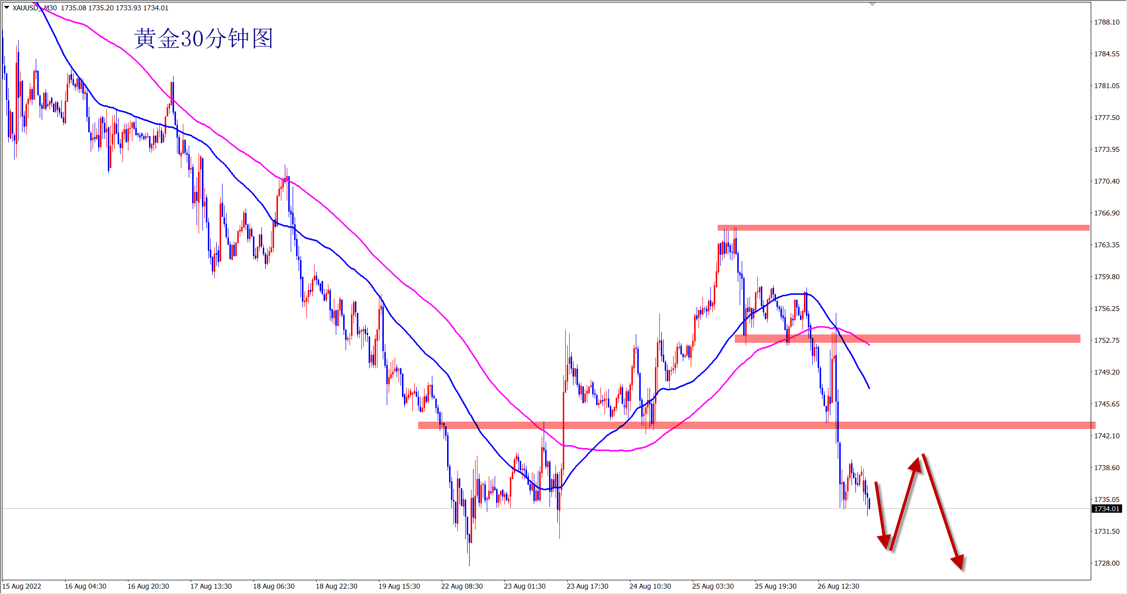 黄金1743空,防守1750,目标1720-1710;