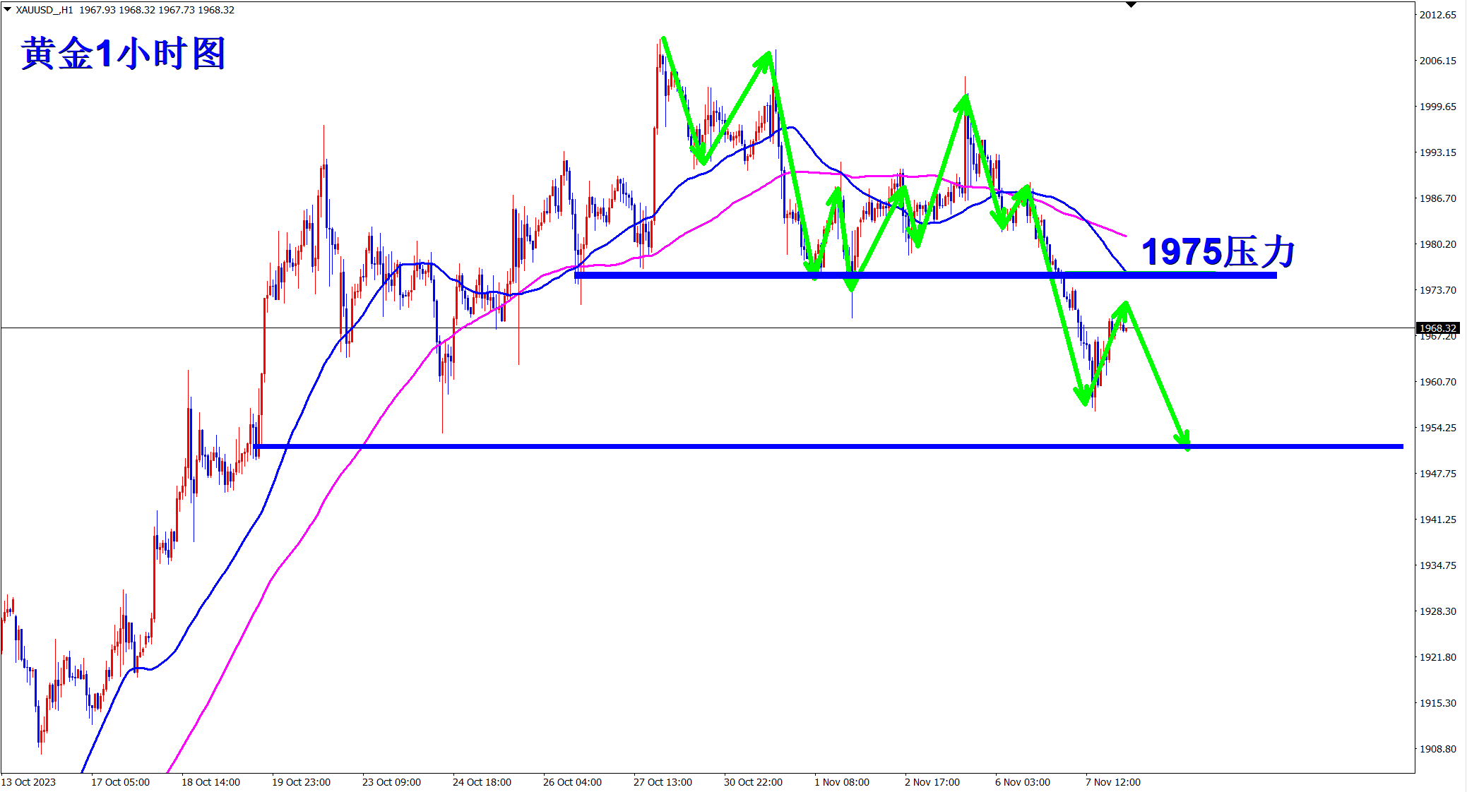 黄金1小时级别可以看出,此前一直是维持均线支撑上行的,但是昨日行情破位后的反抽没有突破均线压制,而是继续下行!也就意味着下跌趋势开启!