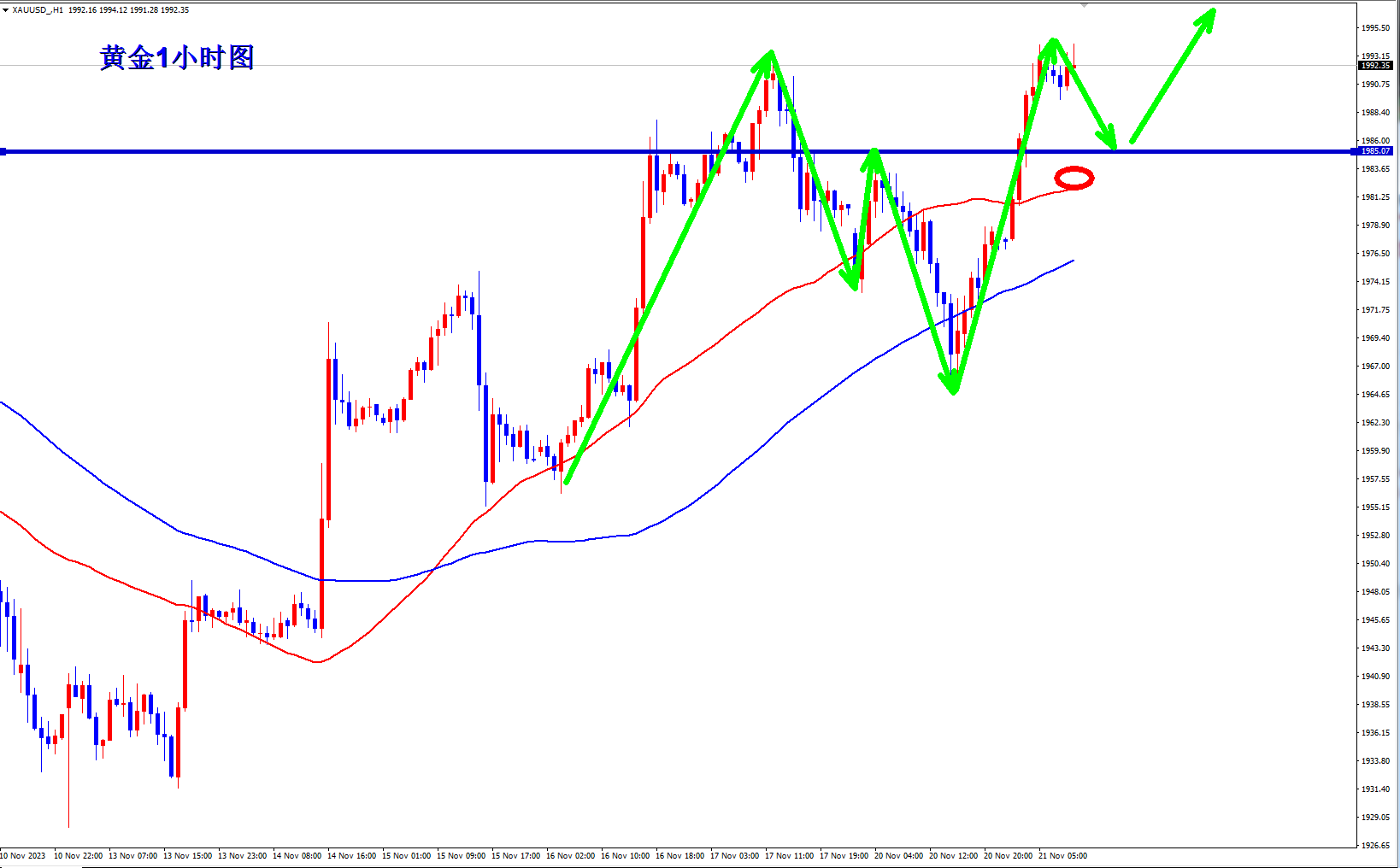 黄金1小时均线稍微拐头之后又掉转向上,多头还是有很大空间,现在黄金下方支撑第一就是昨日的高点1985附近,现在转换成支撑,第二支撑就是1小时均线支撑1982附近,在此区间都是给干多的机会。黄金均线支撑会随时间往上移动,逐步上移到1983附近,欧盘回落1983附近可以先多起来。