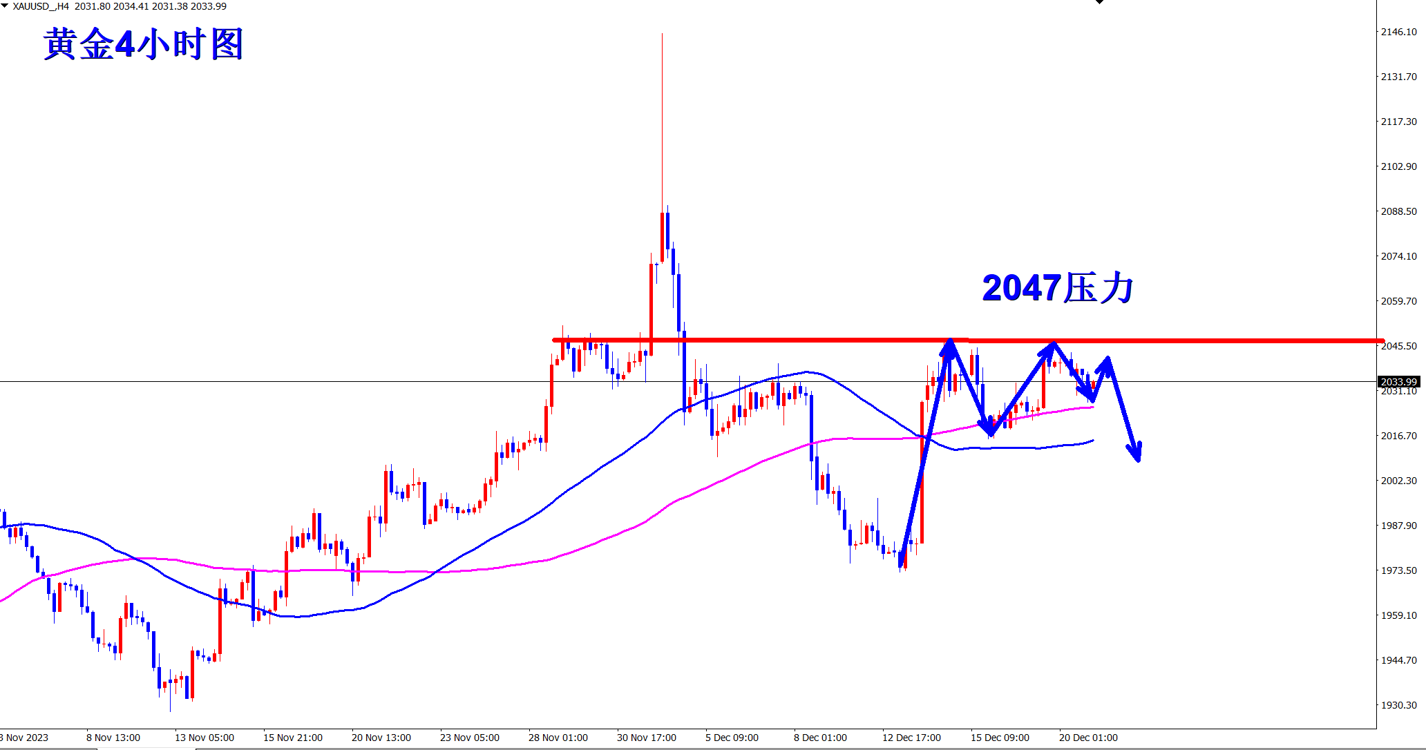 黄金昨日如期下跌,我们2040空和2038空单下跌两连胜收割!当前黄金4小时双顶结构,早盘依托压力还是继续干空,2040附近即可直接空!