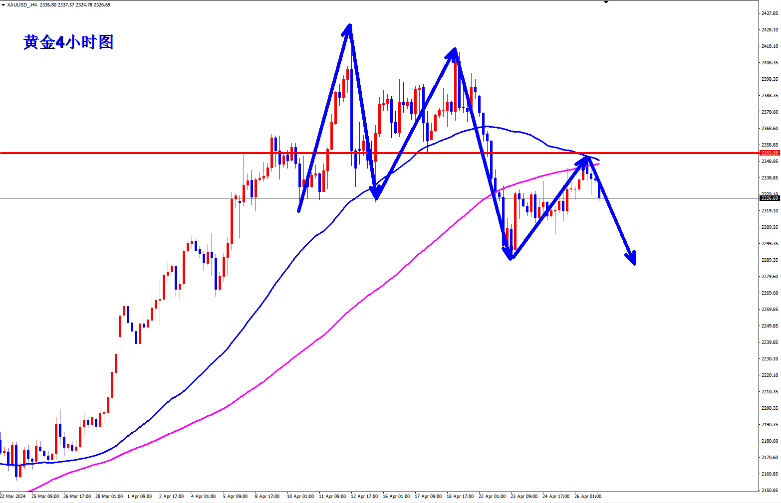 黄金2340空,止损2350,目标2325-2320;