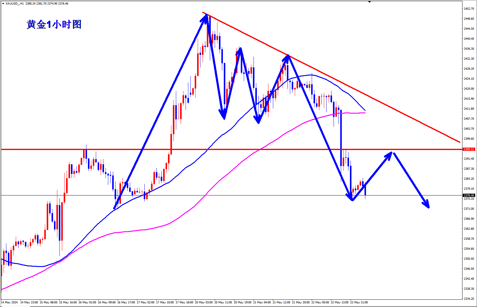 黄金1小时均线拐头,即将形成死叉,如果形成死叉,那么黄金下跌空间还会进一步加大,黄金跌破2400之后反弹弱势,2400关口已经形成压制,黄金昨日美盘反弹2395短线已经形成有效阻力,早盘反弹2395下继续逢高空,反弹2392可以先空起来。