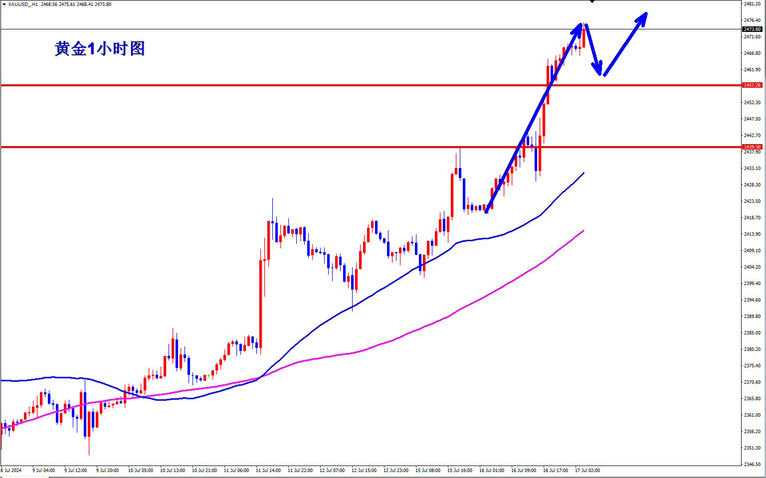 黄金1小时均线不断向上发散金叉多头排列,黄金还将继续上涨,黄金昨天美盘突破历史新高之后,黄金直接加速上涨,然后美盘一直稳定在2457上方,今天2457上方逢低继续干多,多头强势势不可挡,黄金多头还要继续疯狂。