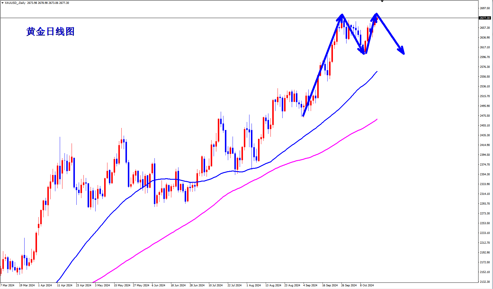 黄金日线现在还是双顶压制,如果承压回落,那么双顶形态就会逐步显示威力,黄金就开始慢慢转弱了,当然,今天有数据,如果黄金直接突破历史新高,那么黄金将顺势继续上涨一波。如果突破历史新高,那么回落则顺势跟进做多,不破历史新高,那么黄金短线继续在2685下逢高先看空,早盘2680附近可以继续先空。