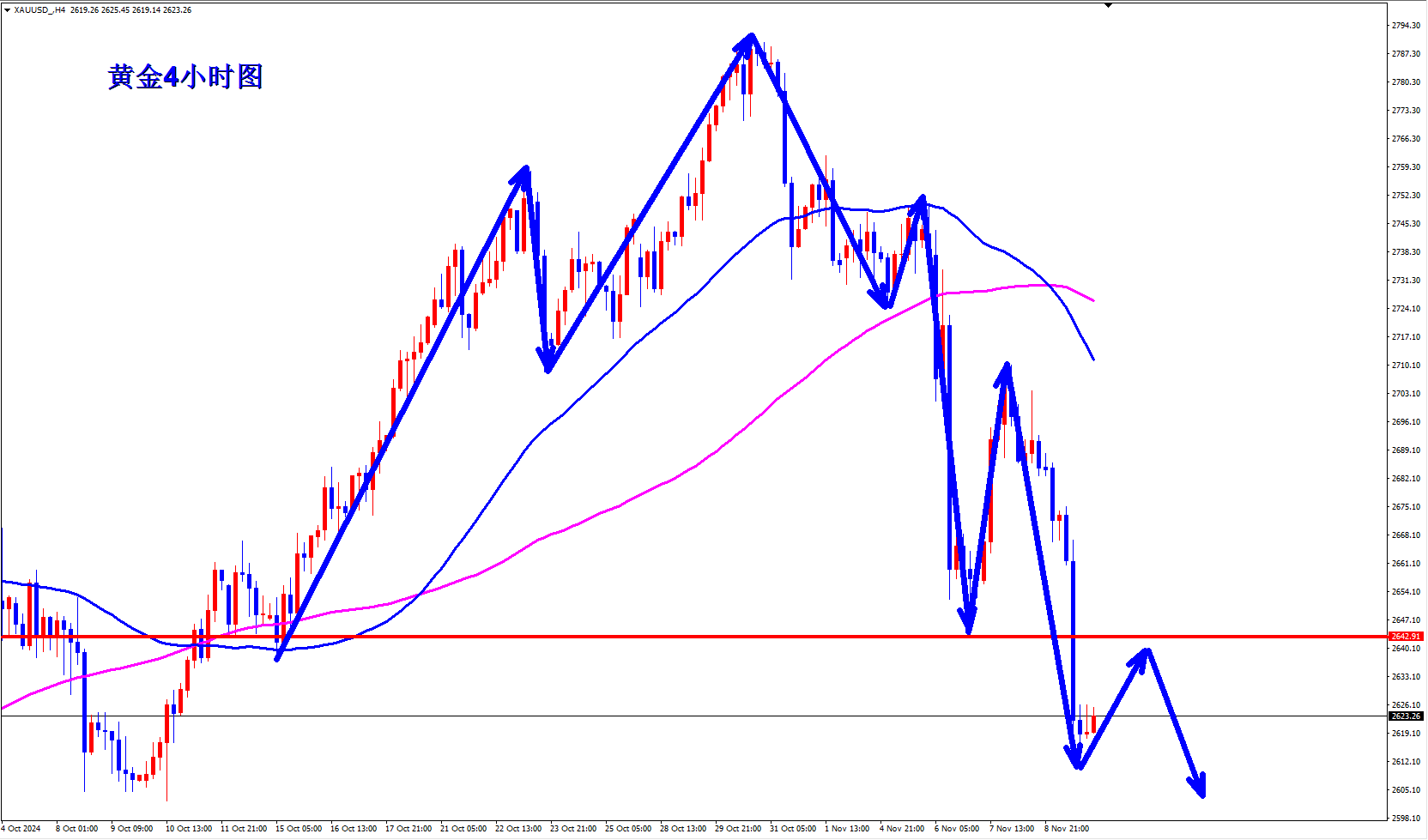 黄金4小时均线继续死叉向下的空头排列,黄金下跌远远还没有结束,黄金跌破上次低点2643之后,黄金现在2643已经变成阻力压制黄金上涨,黄金早盘2643下继续逢高空,黄金早盘反弹2635附近可以先空起来。