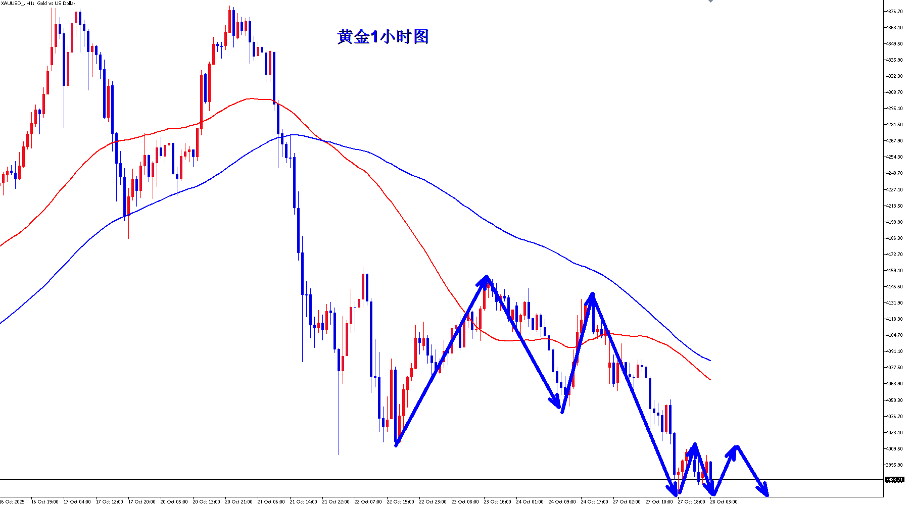 黄金1小时均线继续死叉向下的空头排列,黄金下跌还有动能,黄金跌破4000之后,短线反弹4010附近继续承压回落,黄金多头没有什么力度,黄金早盘反弹承压4010附近可以继续顺势空,不过现在波动幅度较大,如果黄金多头突破了4010,那么上方继续关注4050附近阻力就可以了,黄金整体走势还是继续偏空下行的走势,反弹就是给空的机会。