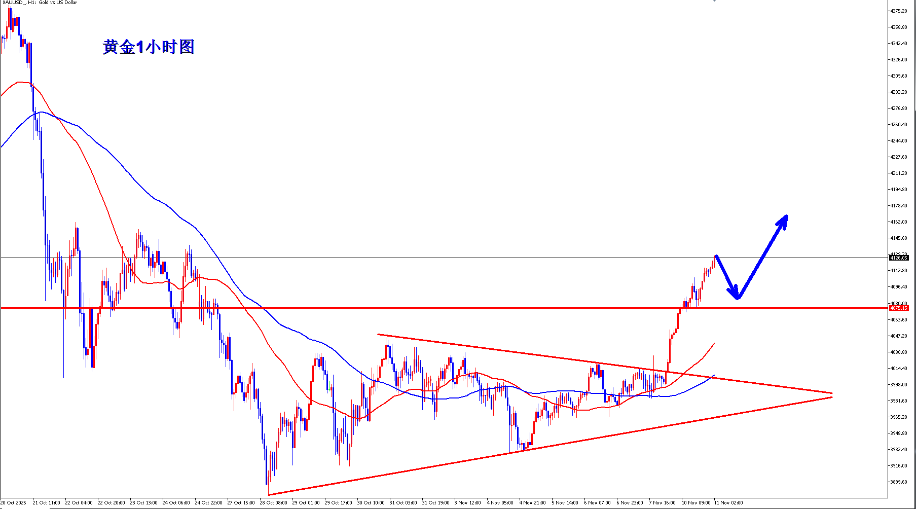 黄金1小时突破上行之后开启了主升浪的上涨,然后基本上一路上涨没有什么大的回调,昨晚美盘突破4100之后,也仅仅是短线回踩4075附近之后再次强势上涨,而且继续突破上行,黄金多头现在上涨势头正盛,黄金早盘回踩4075上继续逢低做多。