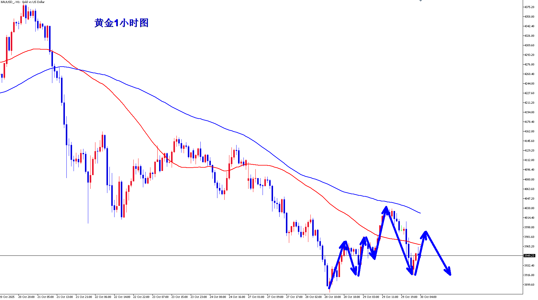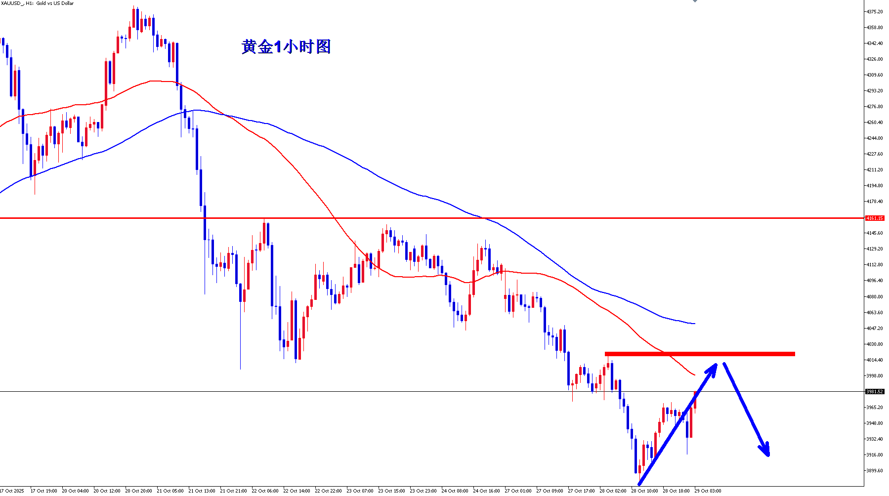 黄金昨天提前消化了美联储的降息预期,黄金等数据出来之后很快就冲高回落,黄金多头还是昙花一现,黄金整体的节奏还是继续偏空震荡,黄金早盘反弹继续空。 黄金1小时均线还是继续死叉向下的空头排列,而且现在黄金也重新回落到了均线下方,黄金仍旧是空头更偏强势一点,黄金昨晚数据之后冲高4007之后很快就快速