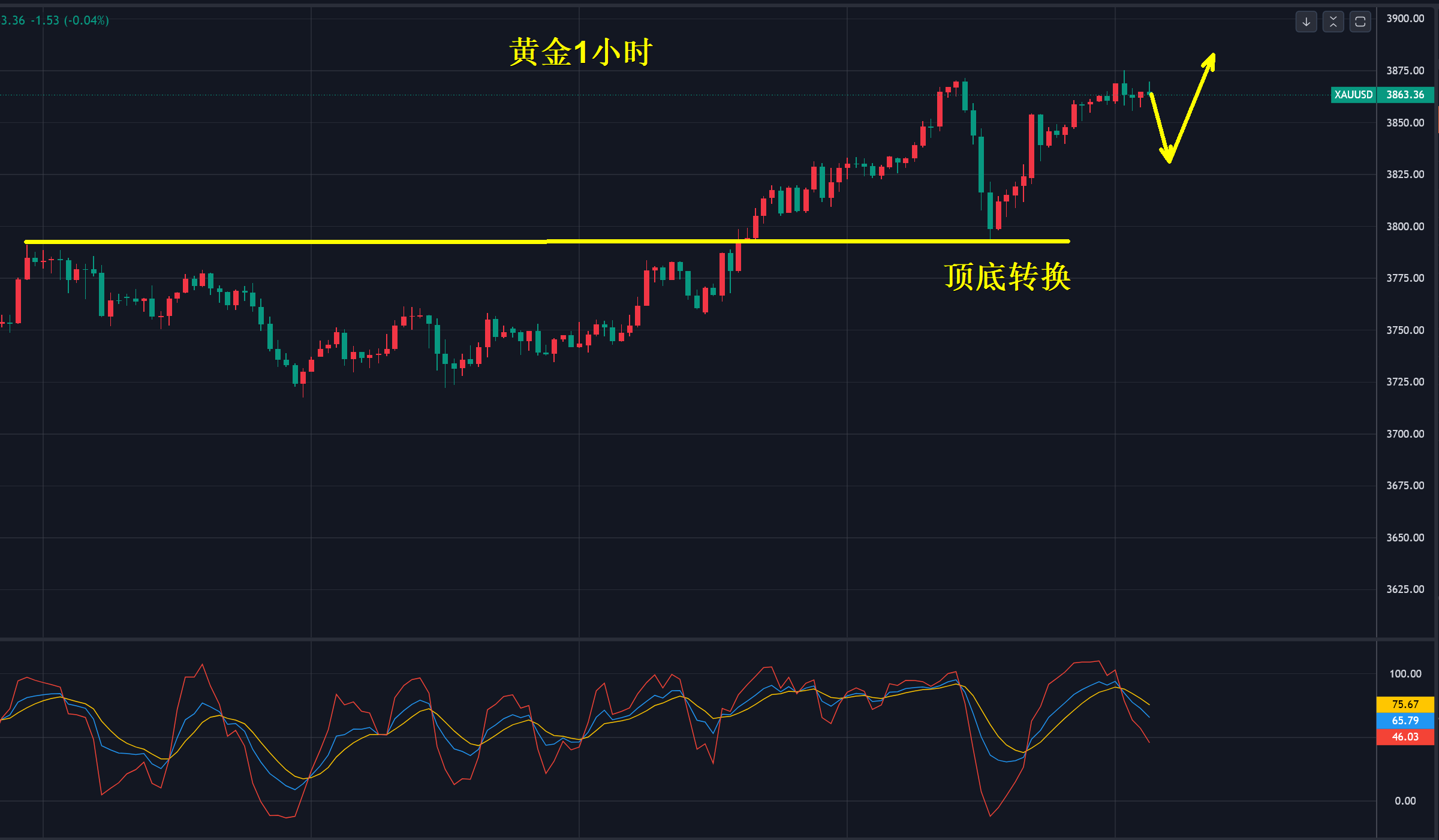 1小时级别,自3870美元快速回落到3800以下,完美完成了顶底转换,二次又回到3870美元的高点位置,今天重点要看前高点3870-75美元的突破情况,也就是欧盘的延续性强弱,不建议直接追多。