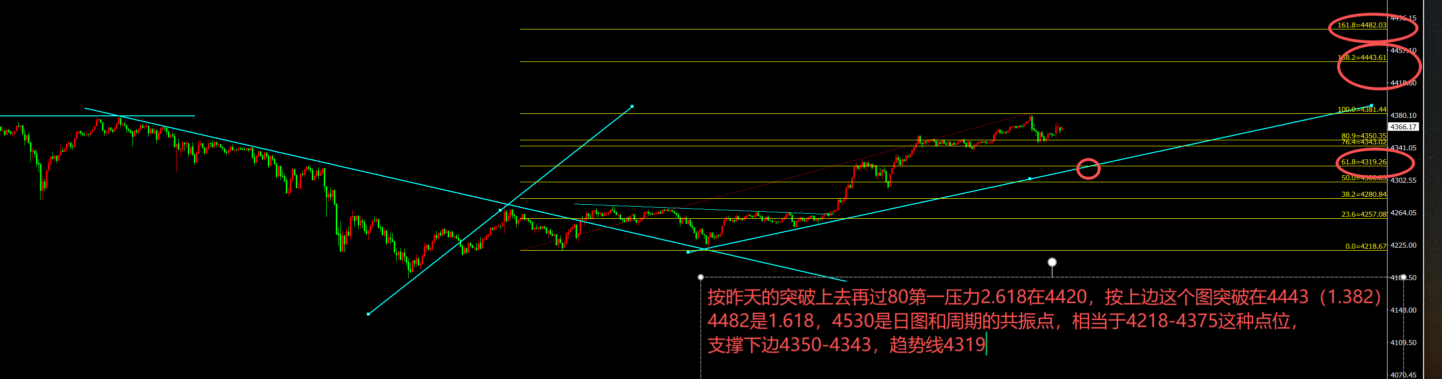 而早盘是没有破高出现回落,但是幅度预期有限,高位随便修正都是20-30美元,对于入场点来说相对要求比较高,目前我们可以看到的首先是趋势线4318附近,强势就是凌晨回落的支撑位,上边突破后向上延伸位就是上图对应的几点4419-4443-82-4530,所以综合几方面得出结论如下: