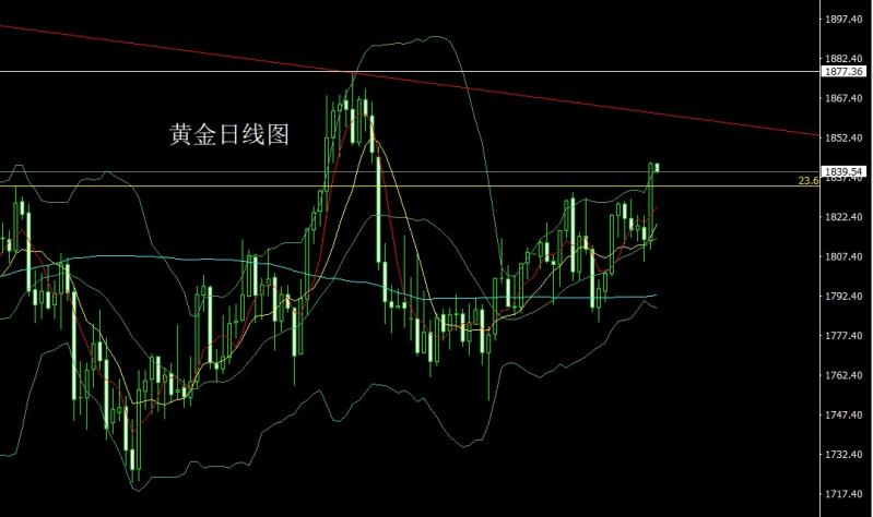 昨日黄金市场早盘开盘在1813.6的位置后行情先回落给出1810的位置后行情震荡上行美盘时段行情受到美债收益率大幅回落而美国总统的讲话推升风险使得市场破位1834压力后最高触及到了1843.5的位置后行情冲高整理,日线最终收线在了1840.3的位置后行情以一根上下影线较长的大阳线收线,而这样的形态收尾后,今日的行情回踩短多,点位上,今日的行情1831多保守1829多止损1826,目标看1843和1850-1852离场,上方如果直接给到1855附近布局空,