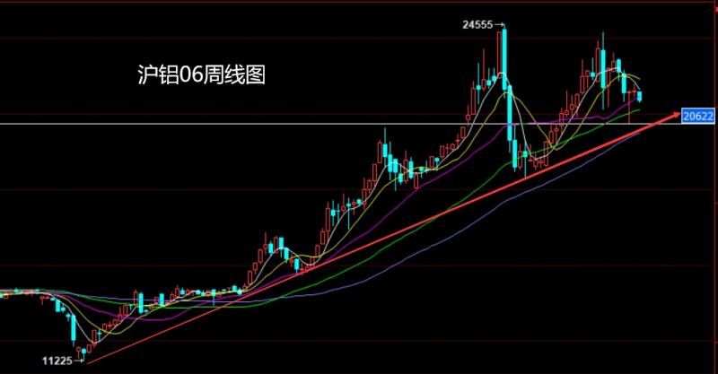沪铝06市场上周开盘在21905的位置后行情先拉升,周线最高触及到了22237的位置后行情快速回落,周线最低给到了21471的位置后行情整理,日线最终收线在了21528的位置后行情以一根上影线很长的大阴线收线,而这样的形态收尾后,本周21800空止损22000下方目标看21400,跌破看21200和20800.