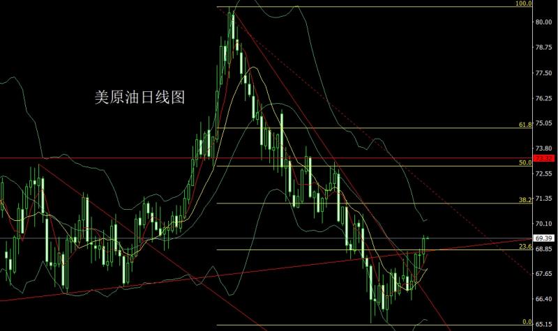 美原油市场昨开盘在68.59的位置后行情先回落给出68.15的位置后行情强势拉升,破位上周高高点也是本轮回落斐波那契的23.6和趋势线压力后行情最高触及到了69.53的位置后行情整理,日线最终收线在了69.35的位置后,日线以一根下影线很长的大阳线收线,而这样的形态收尾后,今日延续做多,点位还是那个,今日68.7多止损68.2,目标看69.6,破位看70和70.5-70.8.