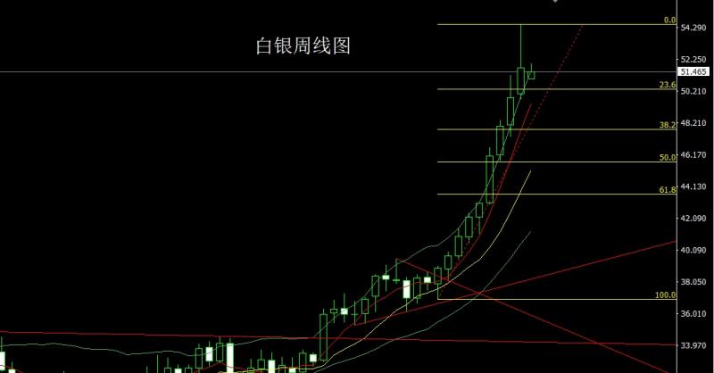 白银市场上周开盘在50.035的位置后行情回踩49.68的周线低点后行情强势拉升,周线最高触及到了54.462的位置后行情尾盘获利了结强势回落,周线最终收线在了51.723的位置后周线以一根上影线极长的类倒锤头形态收线,而这样的形态收尾后,本周初有继续回落的压力,点位上,下方37.8的多和38.8的多和44.6的多减仓后止损跟进在47持有,今日52.5空止损52.8,下方目标看51.4和51和50.5和50.2-50.