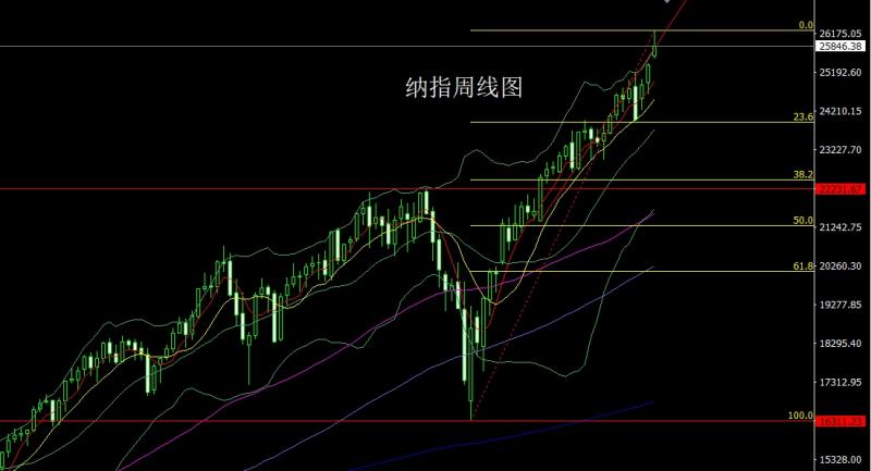 纳指市场上周高开在25605.46的位置后行情回补给出25542.98的位置后行情强势震荡拉升,周线最高触及到了26255.36的位置后,行情冲高回落,周线最终收线在了25846.38的位置后,周线以一根上影线很长的倒锤头形态收线,而这样的形态收尾后,本周26000空损26060,下方目标看25800和25700和25600.