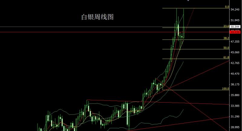 白银市场上周开盘在48.227的位置后行情先回落周线最低给到了47.872的位置后行情强势拉升,周线最高触及到了54.406的位置后行情冲高回落,周线最终收线在了50.544的位置后,周线以一根上影线很长的类倒锤头形态收线,而这样的形态收尾后,下方37.8的多和38.8的多跟进在42持有,今日51.6空止损51.85,目标看51和50.6和50.2和50,破位看49.8-49.6.