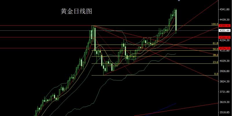 昨日黄金市场早盘小幅高开在4536.5的位置后行情早盘先拉升给出4551.2的历史高点附近后行情出现获利了结过程,盘中跌破多重支撑后行情加速回落,日渐最低给到了日渐级别布林中轨4300.3的位置故意整理,日线最终收线在了4331.4的位置后,日线以一根下影线长于上影线的大阴线收线,而这样的形态收尾后,日线调整基本一步到位,亚欧两盘主要以区间反弹为主,点位上,下方3325和3322的多和3368-3370的多和3377和3385多和3563的多减仓后止损跟进在4000持有,前一周4176和4174的多和4187和4184的多以及4208和4205多止损跟进在4210持有,今日早盘如果先回落给出4290多止损4284,目标看4320好4342和4350和4380压力。
