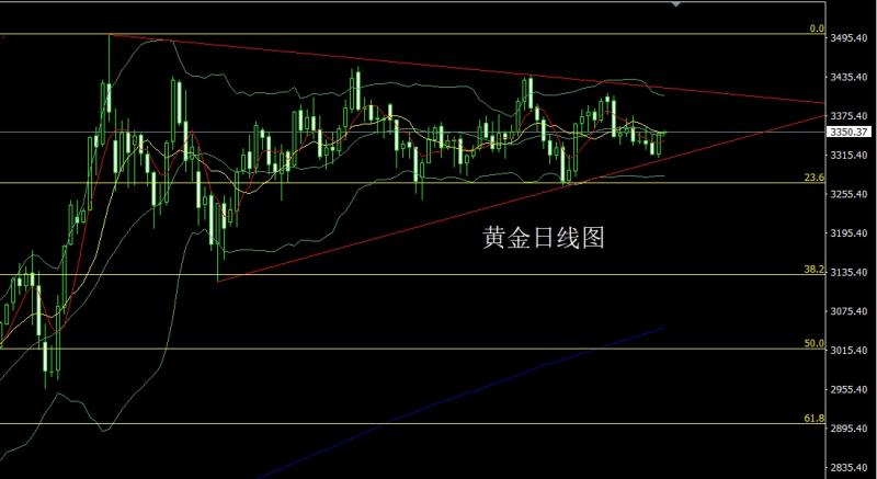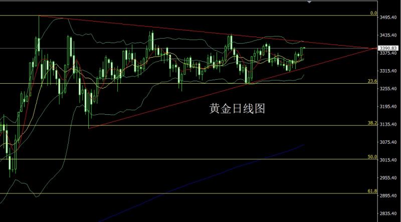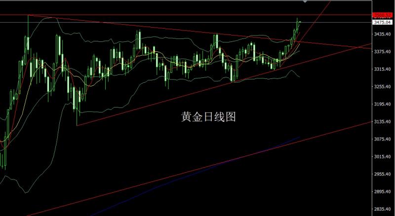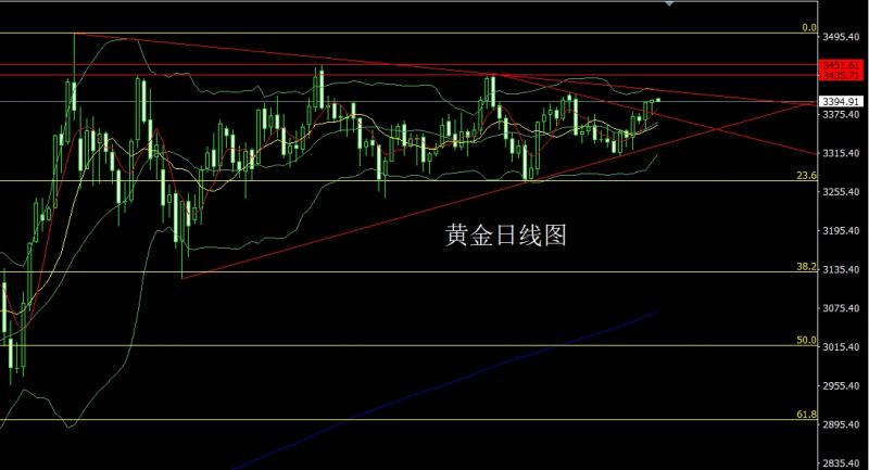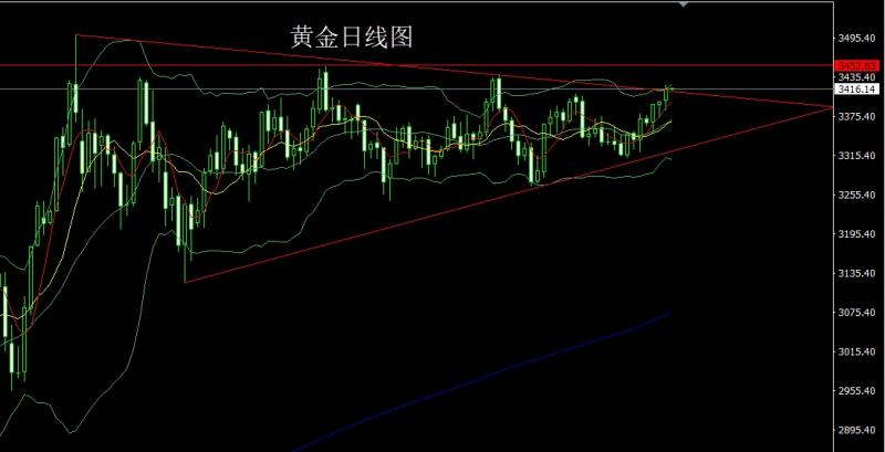 昨日黄金市场早盘开盘在3399的位置后行情先回落,日线最低给到了3384.2的位置后行情受到技术支撑展开拉升过程,美盘时段行情破位三角整理上轨后最高触及到了3323.4的位置后行情整理,日线最终收线在了3416.5的位置后,日线以一根下影线很长的中阳线收线,而这样的形态收尾后,日线有效上破三角压力,今日的行情依旧看多
