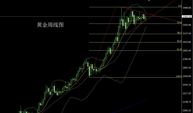 上周黄金市场周初开盘在3336.8的位置后行情先拉升给出3358.4的位置后行情强势回落,周线最低给到了3311.2的位置后行情受到本轮三角整理下轨支撑拉升,到周五美盘时段受到美联储主席鸽派讲话刺激行情强势拉升,周线最高触及到了3378.9的位置后整理,周线最终收线在了3371.7的位置后行情以一根下影线很长的大阳线收线,而